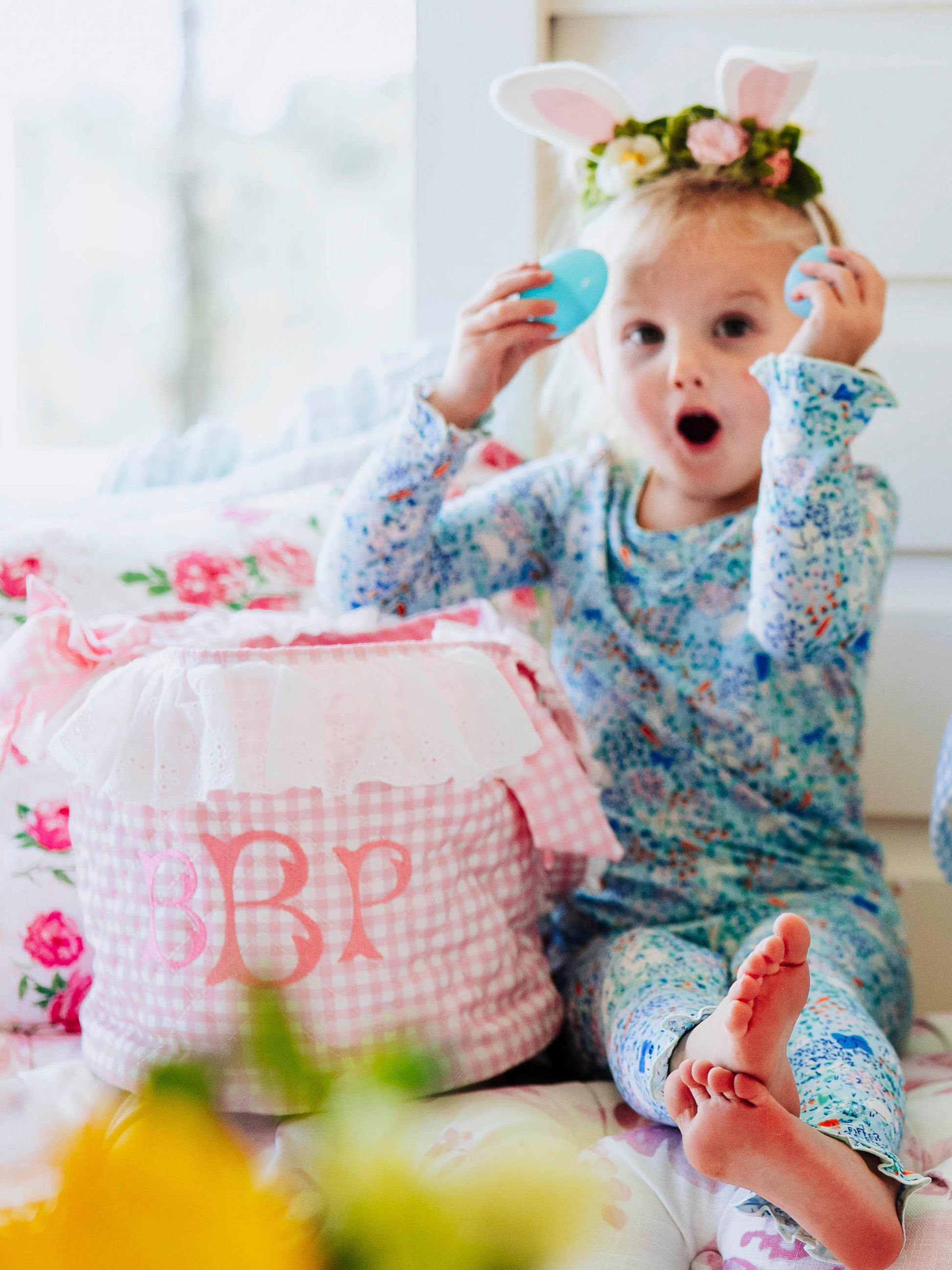 Hop into Easter with the Bunny Pink Check basket! Made from 100% quilted Polyester, this basket is fully lined and perfect for holding all your Easter goodies! With fun details like attached bows, dainty lace, it's perfect for an Easter gift or hunt! Make it egg-stra special by monograming your child's initials, or even more personal with one of our attachable Bunny Pink Check basket is guaranteed to bring smiles and fun to all of your Easter celebrations!?