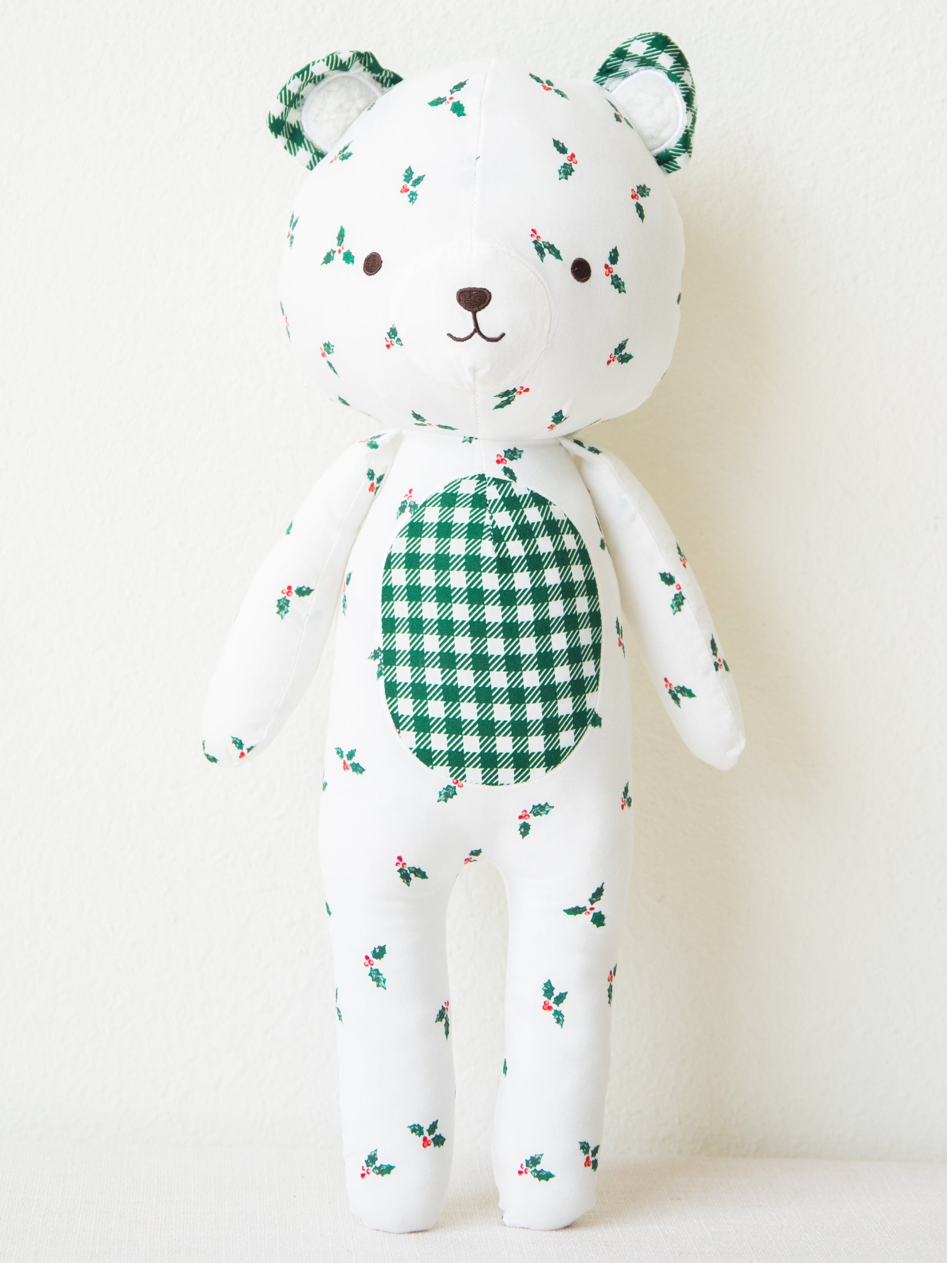 This cuddly Holiday Bear - Angel is the perfect companion for all your wintery adventures! Made from a cozy woven cotton, it features a signature SweetHoney heart on the ear - and who can resist the holly berry with stylish green check accents? Angel's favorite color is forest green - so you know you'll be in good company. Plus, Angel's favorite snack is gingerbread cookies paired with warm tea - so you'll never be hungry for fun! Angel comes with her own decorative bag as well to make for an easy carry!