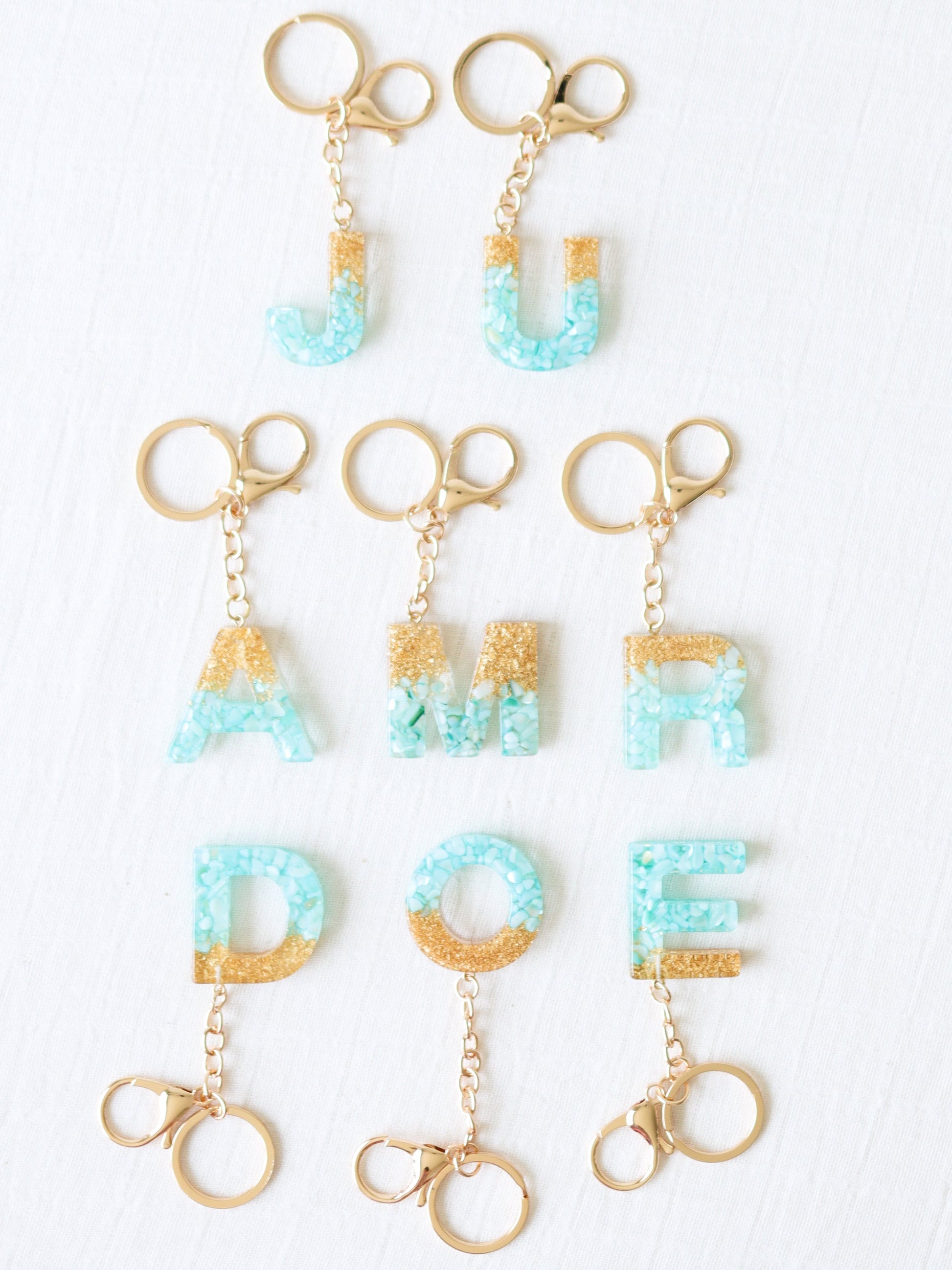 Show your unique style with our Blue Pebbles colored Letter Key Chain! This keychain is made with a blend of resin and metal, and is gold plated, making it both cute and durable. Personalize your backpack, lunch kit, purse, or tote for a fun, fashion-forward statement!